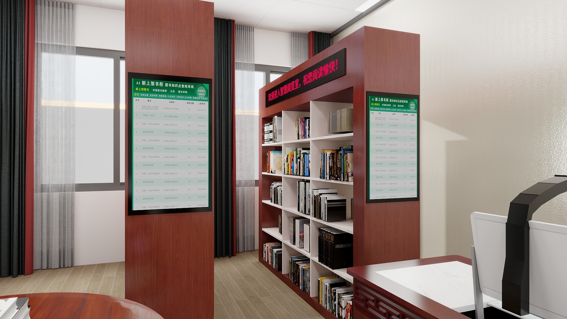 AI新上架書柜兩側都配置有觸摸顯示屏,運行《AI新上架書圖書知識點查閱系統》,用于查看書柜中每本圖書的上架來源數據,包括:被閱讀圖書、檢索出對應的新書、新書知識點的點擊次數和閱讀時長,書籍的上架時間等數據,方便讀者更加了解此書的上架必要性,更加全面的了解此書中重點突出的知識點,更加有利于閱讀學習此書。該同時支持讀者登記自己希望增加的新書信息,由圖書館管理人員負責審核購買。方便采購高頻學員真正需要的熱門書籍。 同時集成聯動1000本電子圖書、100種期刊、20種報紙及具有圖書檢索、公告、視頻、熱門書推薦、推薦知識點查閱、學員個性化學習、隨走隨薦隨學等功能。 AI新上架書系統和AI常看書系統存在一種輸入、輸出關系,AI人工智能閱覽系統統計出讀者的常看圖書,通過AI人工智能檢索系統在各家紙書供應商的最新書目、圖書內容中檢索出對應的知識點內容,再通過讀者對點擊相關文章的熱度,分析出哪些新書上的知識點比較多,而且是讀者所需要的,從而為圖書館提供一個購買新書的決策圖書目錄,圖書館依據此書目進行購買,然后上架在該書柜中。